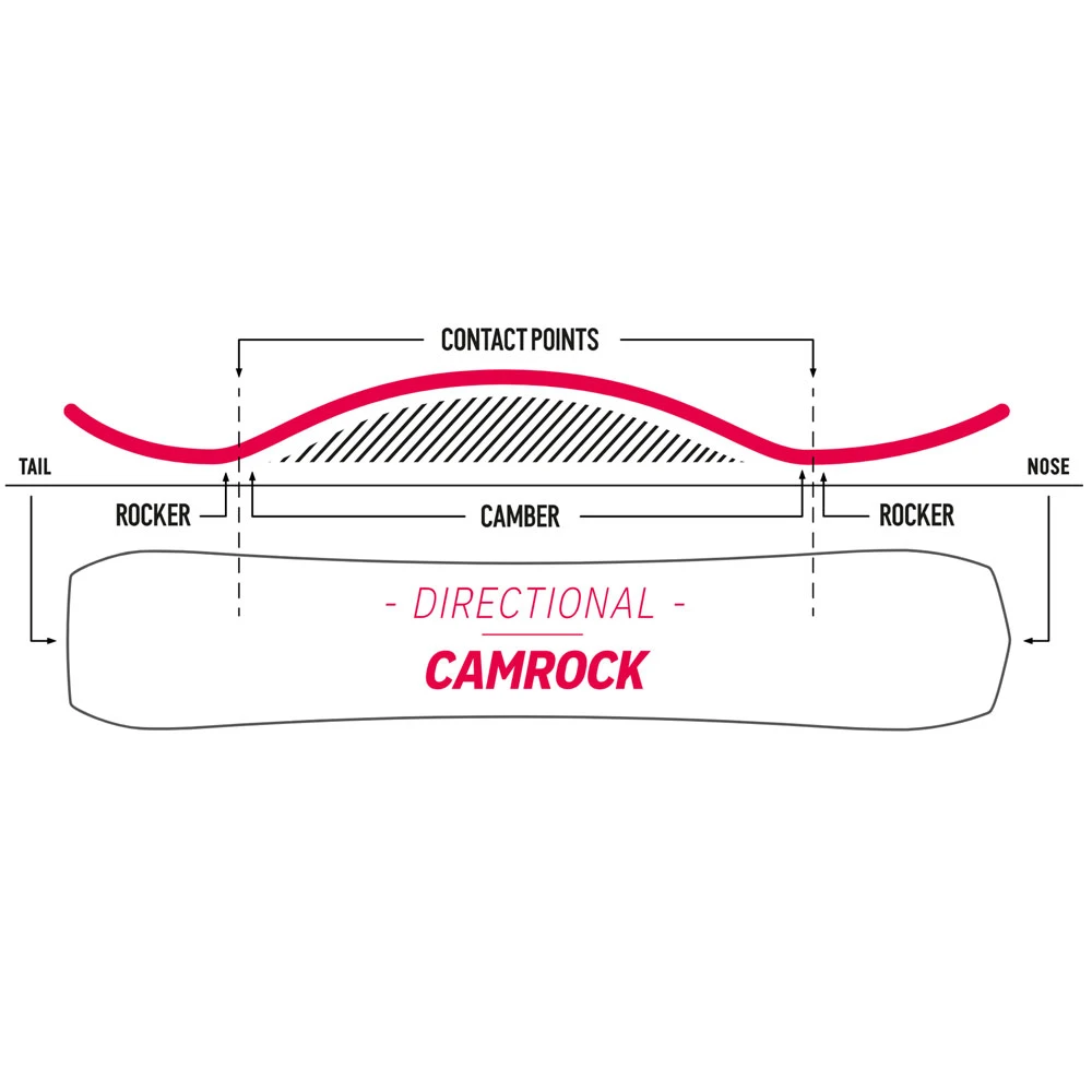 - Profil: Standard Camrock – Camber in der Boardmitte, Rocker Tips