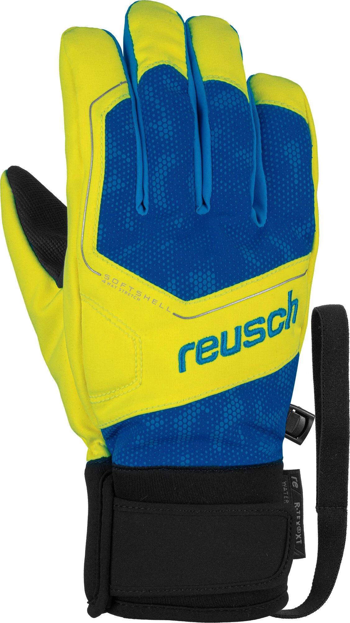 Ein verspielter, sportlicher, angenehm warmer sowie garantiert wind- und wasserdichter Junior Skihandschuh von Reusch mit einer technischen Softshell-Rückhand.